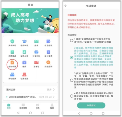 符合免试条件的考生可以通过APP进行免试申请,申请后考生须持本人有效身份证件和相关证明到选定的市州、县市区招生考试机构报考点进行现场审核,报名工作结束后不再补办免试审批手续。